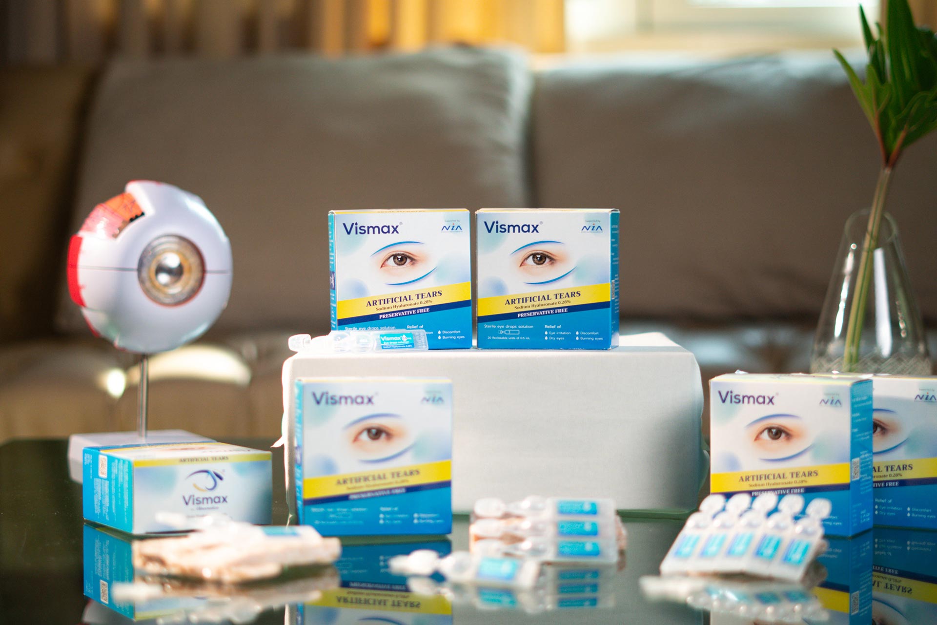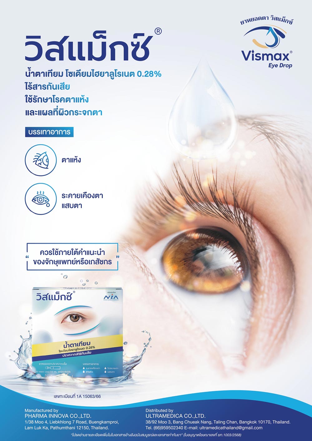 ปัจจุบันมียาที่ได้รับการอนุมัติสูตรตำรับโดยสำนักงานคณะกรรมการอาหารและยาที่พร้อมกระจายสู่ประชาชน ได้แก่ วิสแม็กซ์ (Vismax) ซึ่งเป็นยาที่ใช้ในการรักษาภาวะตาแห้ง